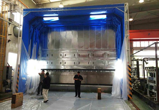 在喷漆房不移动一端安装有水帘式喷漆柜,喷漆产生的漆雾通过水帘净化或排放到车间外部,漆雾由水过滤或回到水池中,定期清除。